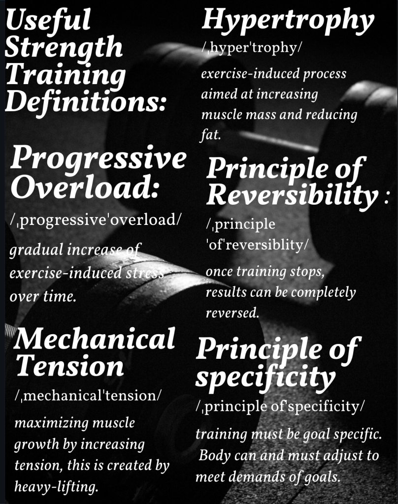 Here is a fact-sheet that defines some of the bodybuilding principles that you may come across when reading some fitness-related content. You can save or print this image in order to have the definitions nearby. The principles that I have defined are important for understanding some of the instructions and concepts mentioned in strength training programs and literature.