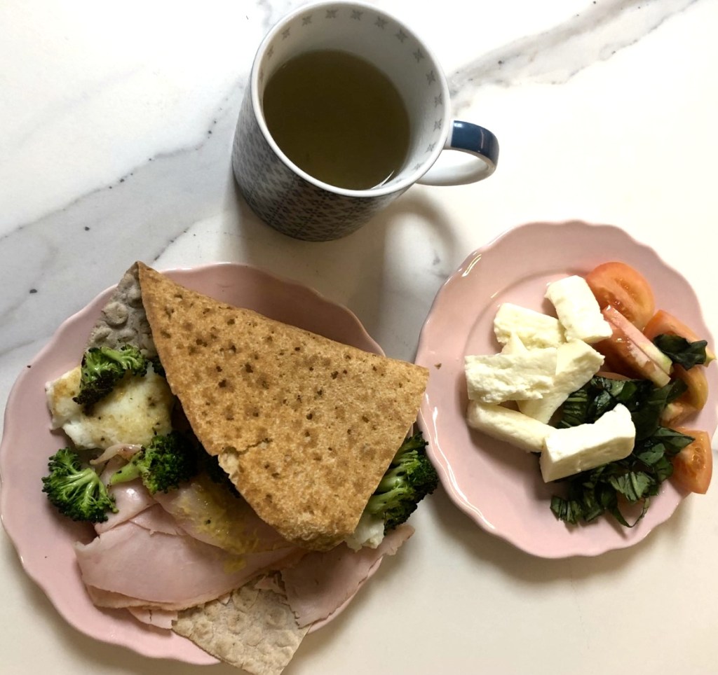 A big muscle-building breakfast is brown pita bread with four egg whites, 1/3 light halloumi cheese, steamed broccoli and some turkey. Because the pita bread is so light, I can even have the rest of the light halloumi with vegetables so I leave it on a small plate.