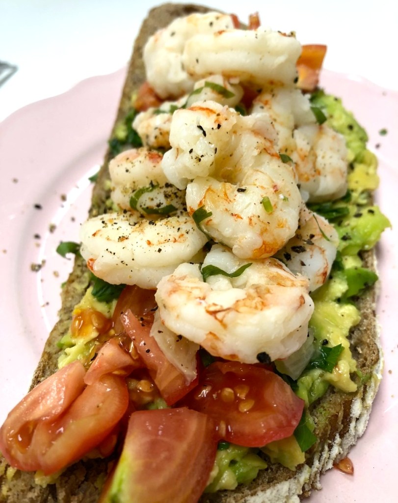 Avocado toast with shrimp is my favourite out of the list, it requires very little planning and can be done in less than 20 minutes. For this Avocado Toast, I mashed half an avocado, added in a bit of parsley, some salt, black pepper, tomato and steamed shrimp.