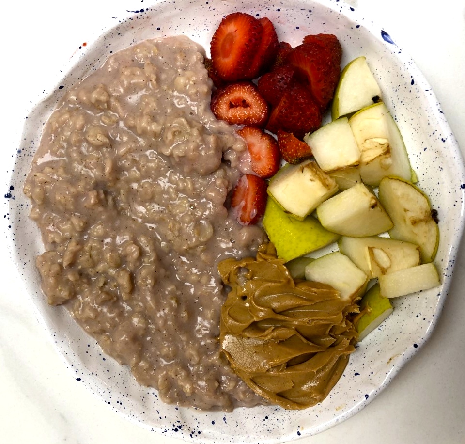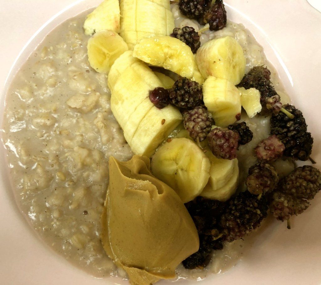 The staple of any bodybuilding diet is oatmeal, so I always eat it a few times a week, I recommend adding peanut butter and fruits and even adding in some protein powder to it for extra nutrition/fuel. I definitely would not shy away from adding toppings in the morning but would make sure that the toppings are natural and as un-processed as possible, this applies to the peanut butter as well, I try to go towards organic sources.