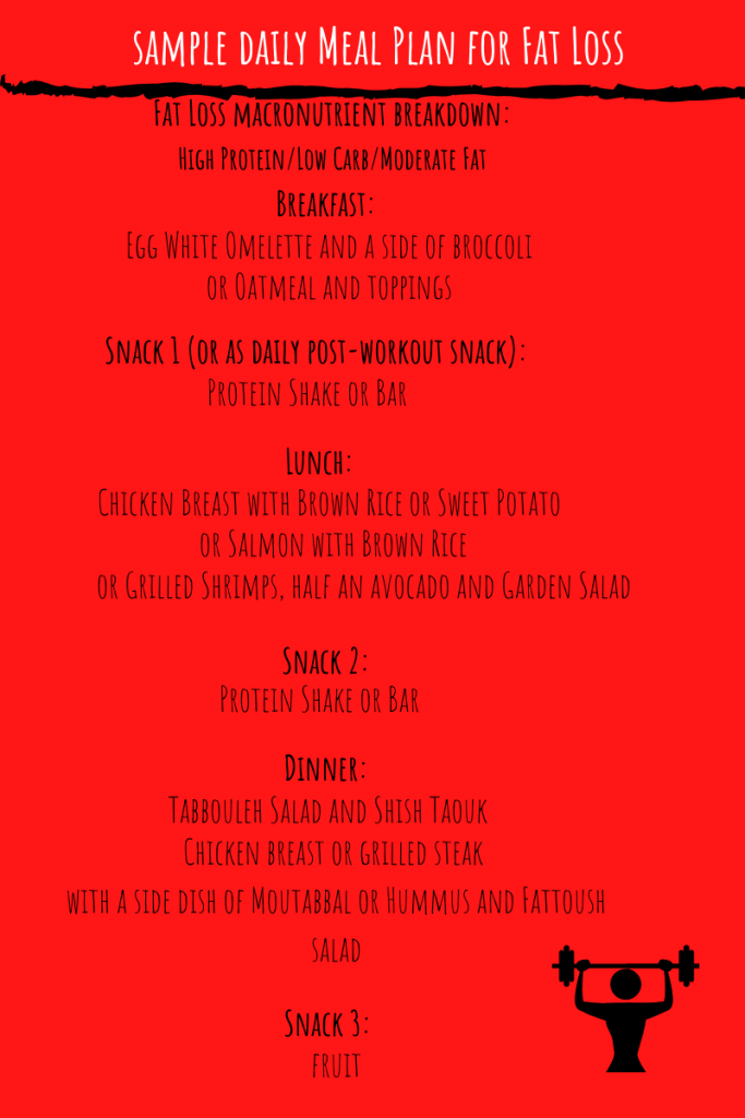 Below is a template on how one would eat for fat loss, with Lebanese foods added for my readers who live in Lebanon or in the Middle East.