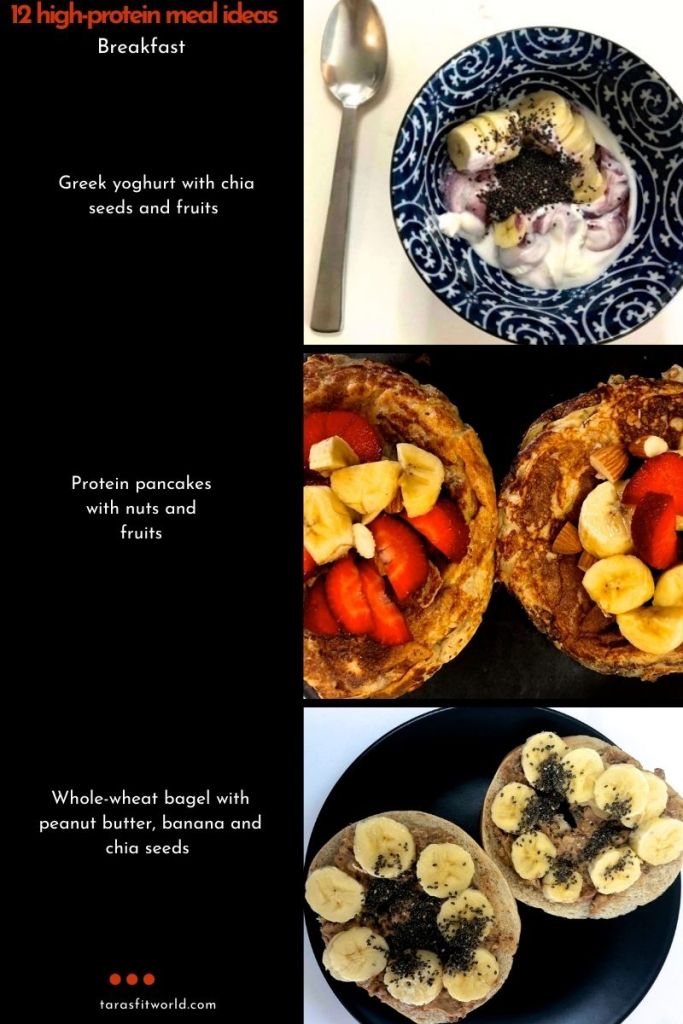 I broke down the visual post into breakfast, lunch, snack and dinner ideas. For breakfast, we have greek-yoghurt, protein pancakes and peanut butter on a whole-wheat bagel. If your aim is to gain muscle mass, I definitely recommend trying these!