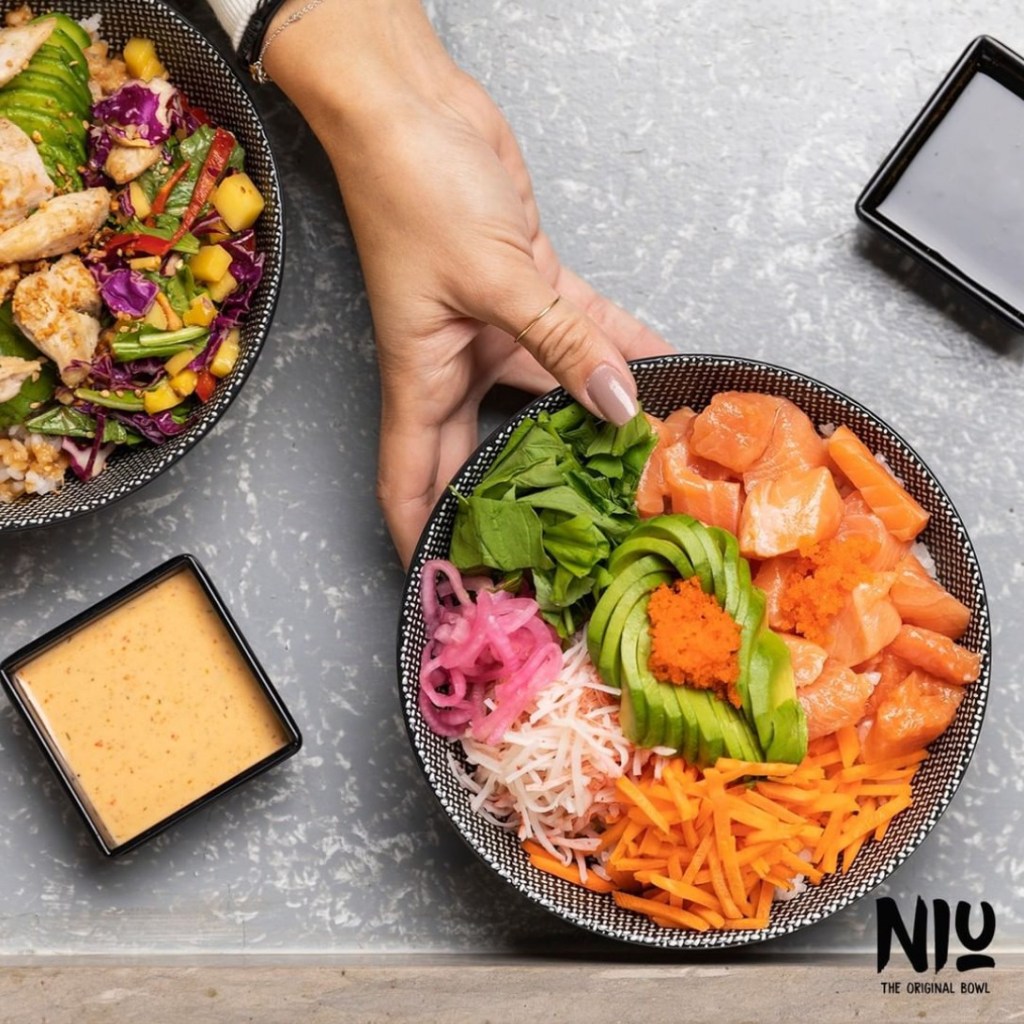 Niu has a wide variety of healthy vibrant poke bowls (including customizable options), sweet acai bowls with sugar-free/low calorie options to customize them with.