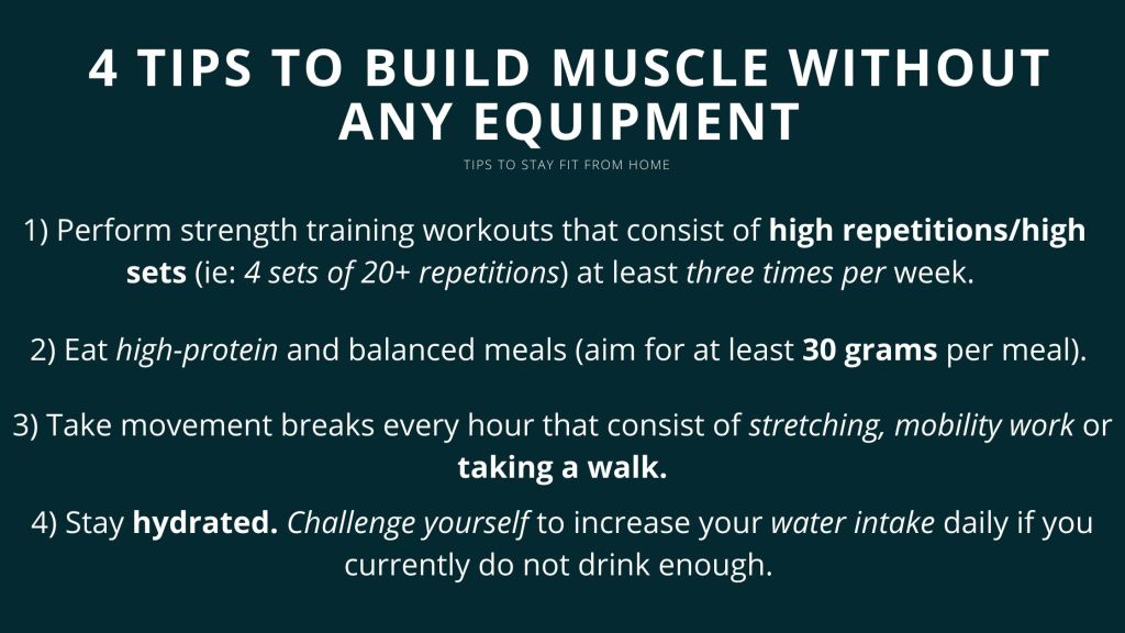 In conclusion, the four best tips that I can give to build muscles from home are to firstly engage in high-repetition, high-set workouts.