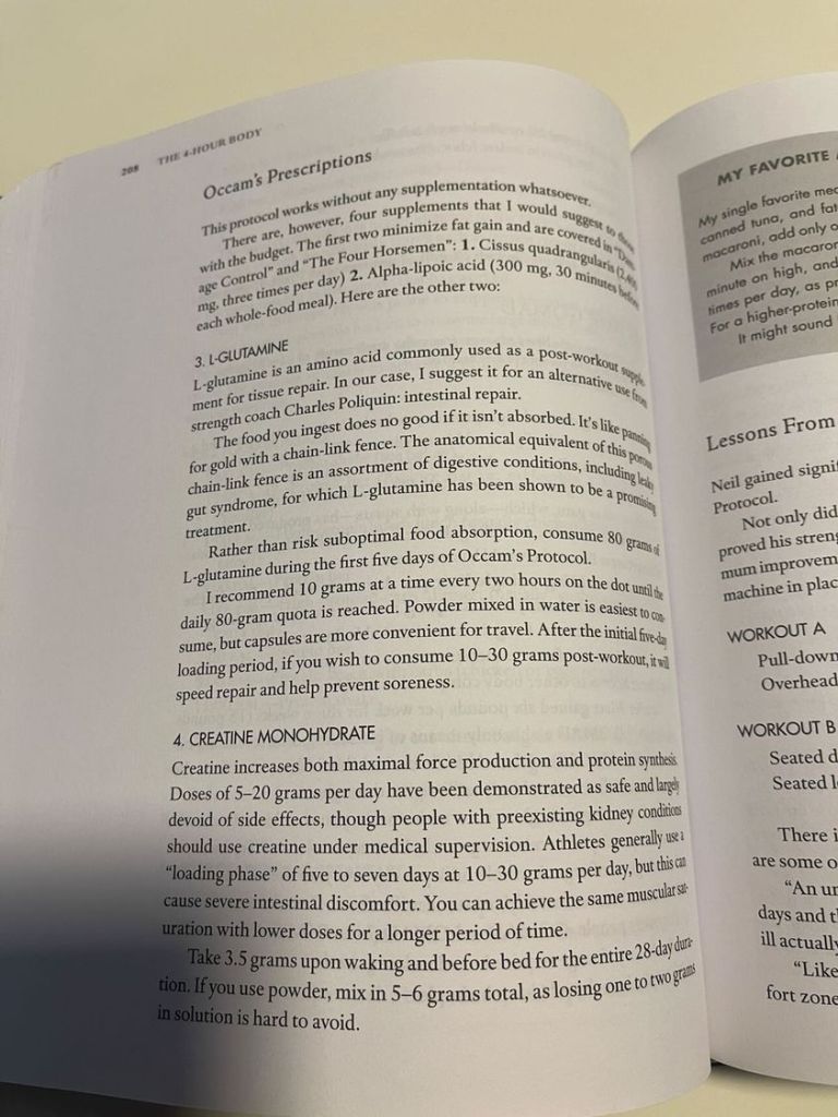 Ferris recommends consuming 80 grams of l-glutamine during the first five days of Occam’s protocol. He also recommends consuming creatine monohydrate to increase strength, fat-free muscle mass and protein synthesis.