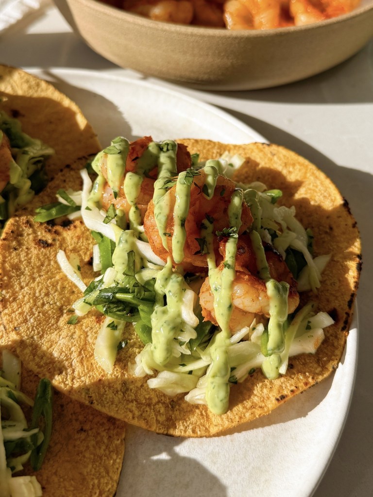 - Assemble the tacos by placing a few shrimp on each tortilla. Top with shredded cabbage, avocado slices, and a sprinkle of cilantro.
